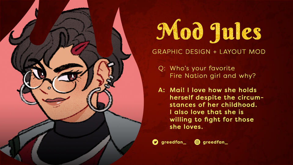 This zine is centered around the ladies of the fire nation: Azula, Ty Lee, and Mai! The spread will encompass a combination of short stories and artwork our contributors will supply. There is currently no theme, just fun content about the girls.