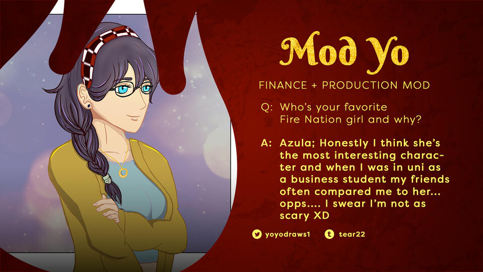 This zine is centered around the ladies of the fire nation: Azula, Ty Lee, and Mai! The spread will encompass a combination of short stories and artwork our contributors will supply. There is currently no theme, just fun content about the girls.